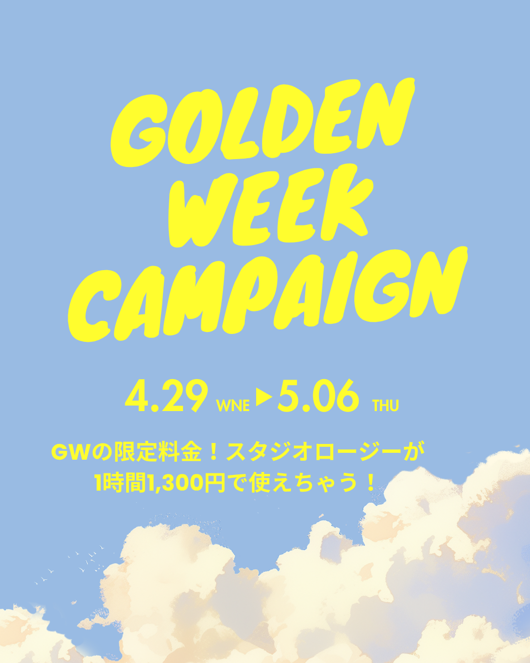 GW特別企画として、**スタジオ利用料を【1時間1,300円】**の特別価格に設定します!