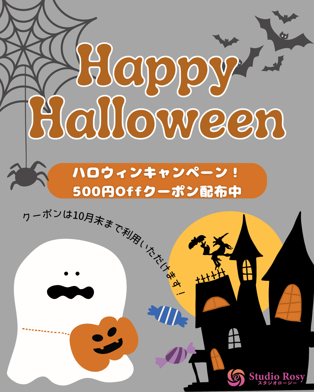 2025.10.14 ハロウィンキャンペーン開催中 こんばんは。スタジオロージーです♪ いつもご利用いただいているお客様へ ハローウィンに合わせて、どなたでもお使いいただける500円クーポンを配信いたしました! 予約専用LINEのメニューから【クーポン】をタップすると受け取れます。 このクーポンは10月31日(金)までのご利用に適用されますので、お早めにクーポンを受け取り、お得にスタジオを活用してくださいね♪ 皆様のご利用を心よりお待ちしております! Post